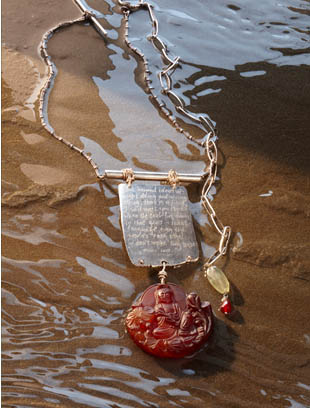 I read that Alicia Keys has collaborated with a jewellery designer on a new line, called The Barber’s Daughters. Opened up on the splash page to see this necklace and thought …. hmmmm. Pretty. But it immediately reminded me of very similar work by Jeanine Payer, who also uses sterling silver, hand engraving of poems and semi-precious stones.
