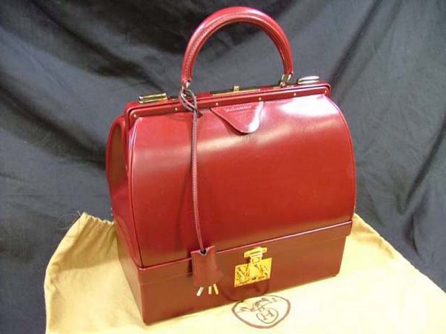 Strictly speaking, not a jewel, but an incredibly luxe way to transport them. These handcrafted bags used to be de rigeur for wealthy ladies on the go. The top half functions like a purse and the bottom snaps open to reveal a velvet lined tray for carrying precious baubles. This one is made of fine box calf with gold plated fittings and a lock and key for the top and bottom sections. I believe it dates from the late 1950s. It is still possible to find them in excellent condition at auctions and through high end vintage dealers. They were also made by other manufacturers as train cases, or jewel cases.