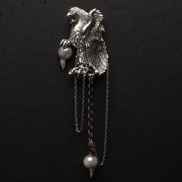 I was searching for a wonderful brooch I saw in New York, the head of a pig made completely out of pearls and called (of course!) Pearls Before Swine. I didn’t see it (and can’t recall the artist’s name) but I did find this web site based out of Montreal, www.pearlsbeforeswine.ca and this great brooch. It features an eagle clutching a pearl and will speak to your inner (or outer) Goth. Contact information is on the web site.