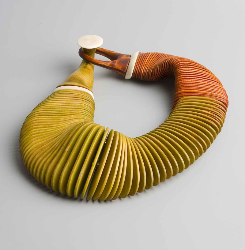 Liv Blavarp is a Norwegian artisan who works in wood. She handcrafts each piece and created necklaces with a sinuous form. If they were displayed as sculpture, they would not be out of place. She is represented in the United States by Charon Kransen (www.charonkransenarts.com). She produces fewer than 20 pieces a year and with the amount of work involved in each, it’s easy to see why her output is so limited.