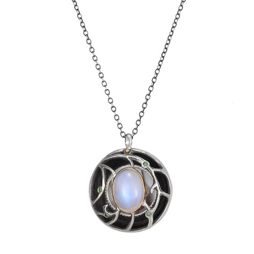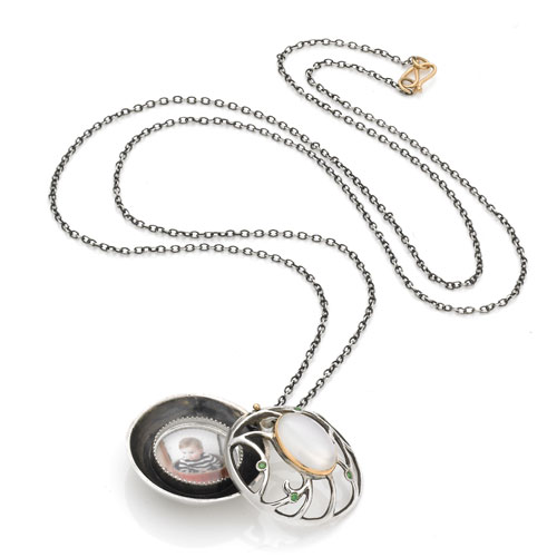 Part of our signature photo piece series, this necklace features a high polish, sterling silver locket accented by four tiny green diamonds and a single moonstone set in an 18k gold bezel. The locket is brushed silver on the back and is held together by an 18k gold rivet. The pendant opens to reveal a picture frame in which the wearer may insert a custom photo through an opening on the back. A circular watch crystal protects the photo. Hand engraving appears on the back of the pendant.