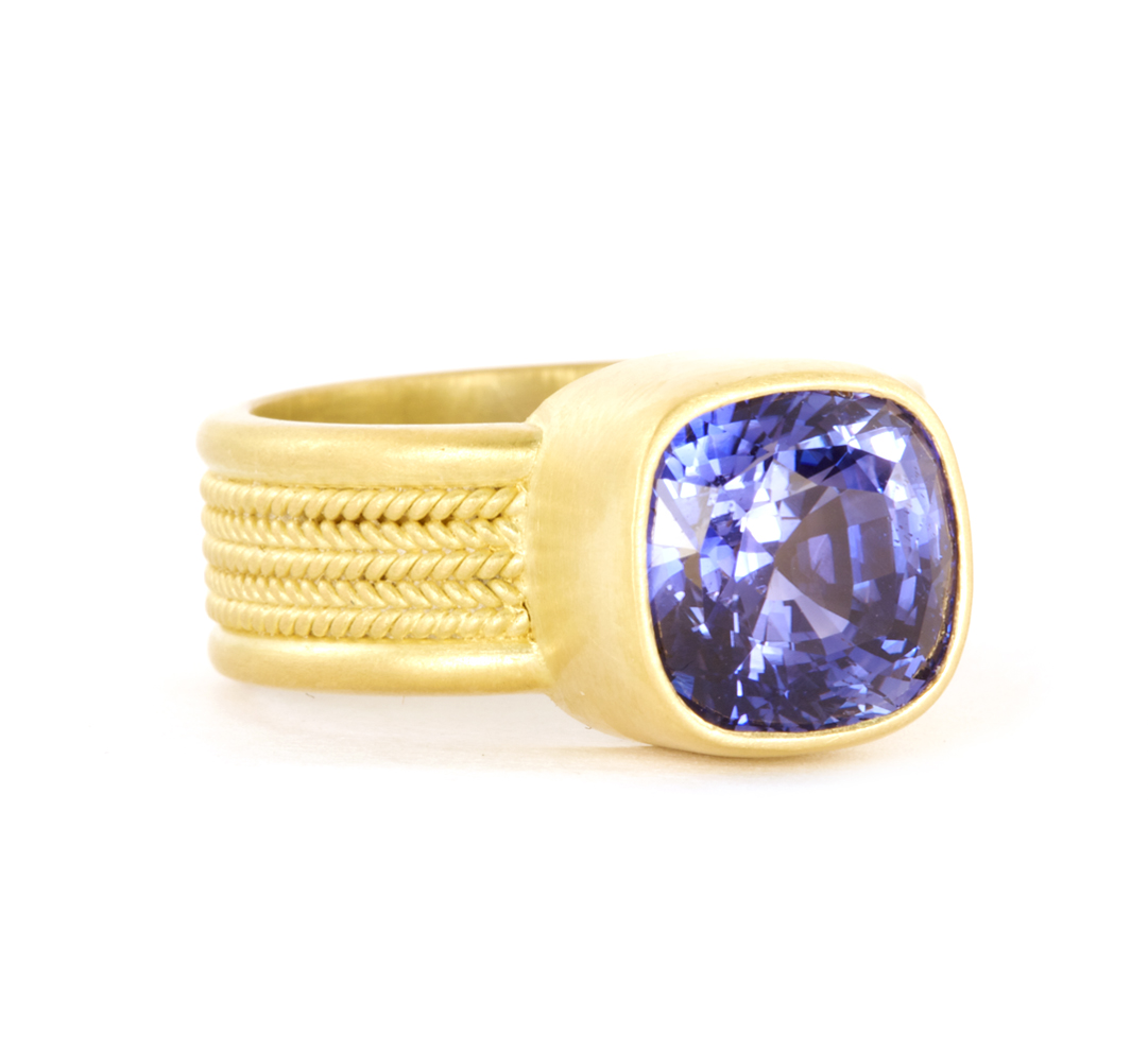Reinstein Ross in New York offers their own custom blend of buttery golds – 18k chartreuse, 20k peach and 22k apricot – as well as white gold and platinum for their designs. (They will also work with your stones and help you design something you like.) Pieces range from delicate bands with precious or semi-precious stones, to chunky rings like this one, described on their web site as “Fine Modified 5 Braid Ring with Cushion Cut Blue Sapphire”. No price is indicated; you have to contact them to find out. When you look at their items by price, it does show up in the $4,000+ category – no surprise. For more eye candy, www.reinsteinross.com.