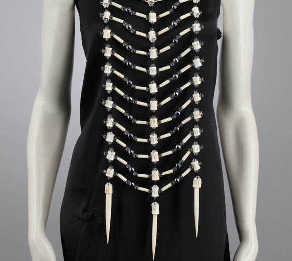This is more of a breastplate than a necklace and would definitely be the star attraction over very minimalist clothing. A collaboration with Belgian artist Daniel Weinberger, the pair were inspired by the book “The Glass Bead Game”, by Herman Hesse. The pieced is composed of vintage glass beads and bone, hand strung and closed with a t-clasp.