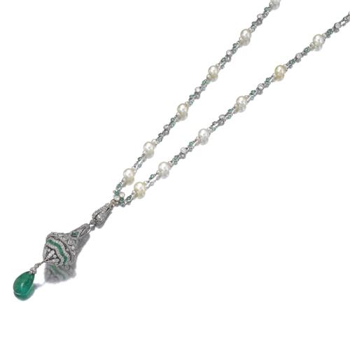 Some deco pieces can be overworked but this one just speaks to me. It’s simple and elegant and has the clean lines deco is known for without being gaudy or overdone. Comprised of saltwater natural pearls, a diamond, emerald and pearl chain with an emerald drop, it’s available from Sotheby’s, auction estimate 22,000-32,000 Swiss francs.