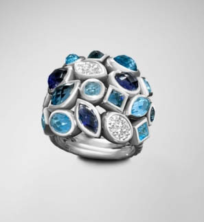 When I heard that Mr. Yurman had bought a copy of my book on Sherman jewellery I was kind of tickled … and wondering if perhaps the bright colours and out there glitz of Sherman might rub off. No such luck. I did find this very pretty ring, made of blue topaz and pave diamonds, though. And the most colourful thing I saw in his new collection. So maybe he was a little bit inspired by Sherman. Retails for $1350 USD.