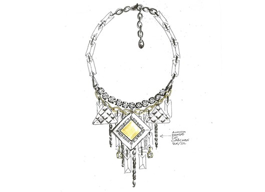 Here is a sketch from her upcoming line, from www.wwd.com. At a time when necklaces seem to be scaling down somewhat from the “pile it on” aesthetic so popular recently, whoever is designing this for Kardashian wants to perpetuate the look. If this is all the rage in LA or Miami, count me out.