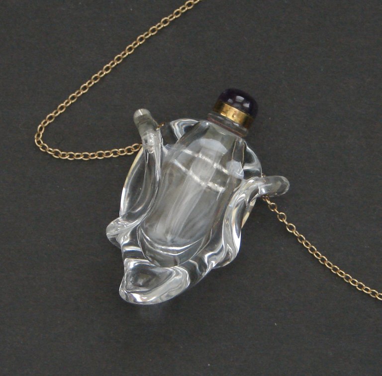 I bought this wounded soldier on Ebay quite inexpensively because at one point, it was dropped, one of the arms through which the chain passes broke off, and it was glued back on. Although the repair was nicely done, it’s evident when you look at it, and lowered the piece’s value dramatically. The rock crystal flask is fitted with an 18k gold and amethyst topped stopper. You could fill it with perfume if you were very brave – I am not!