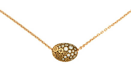 Available at select jewellers; see more of his work at www.alexsepkus.com. Called the bean pendant, this piece sells for USD $3,850 and does not include the chain. It is 18k and has a diamond weight of 0.38.
