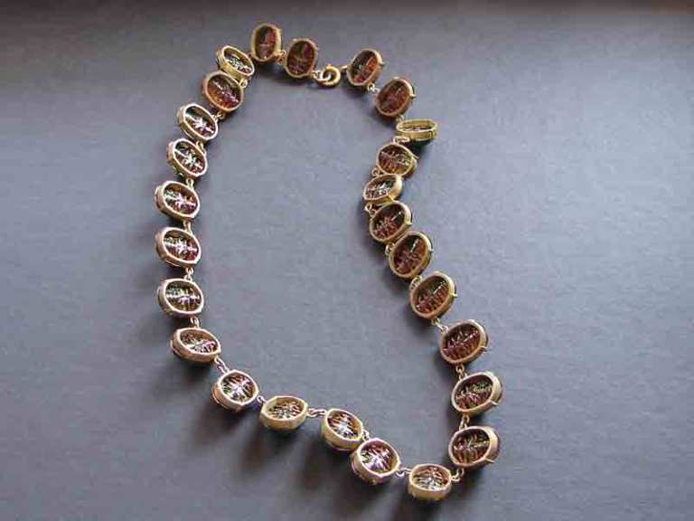This Victorian necklace of actual scarab beetles set in brass shows the relatively small scale that was used. And you can see from the open backs the beetle carapaces.