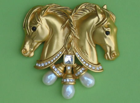 Liza Todd-Tivey is a well-respected sculptor renowned for her ability to render horses in a startlingly realistic manner. She has a small number of pieces of jewellery on her site, including this wonderful double horse brooch, called Hearts in Tandem. Using matte faux gold and pearl drops, the finish reminds me of Elizabeth Gage’s work. The piece was done for Avon as part of the Elizabeth Taylor line.