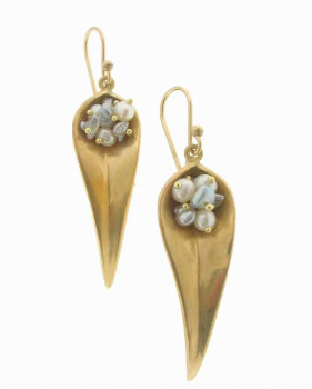 People wrongly associate pearls with a too ladylike or conservative look. There are many different kinds of pearls and ways to wear them. In these earrings, designer Annette Ferdinandsen wires small baroque pearls into a cluster at the top of a leaf form. Elegant and definitely not an old lady look. These are available for USD $1,170 at Ylang23; Ferdinandsen is also widely available online.