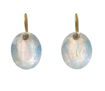 Here she offers a pretty pair of moonstone drop earrings on a 22k wire set with tiny aquamarine stones. Available at Twist for USD $2360.