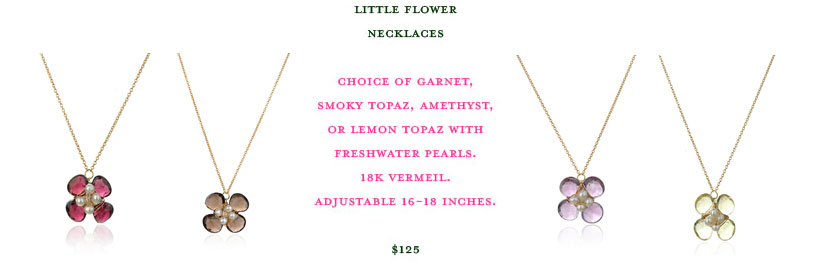 Amanda Rudey designs sweet pieces with semi-precious stones using vermeil (gold plating over silver). Her prices are extremely reasonable and the jewelry has a nice fluidity and ease. It would look good with formal wear (she has a bridal collection) but also elegant for more dressy days.