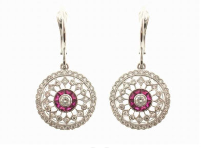 These1/2 inch diametre ruby and diamond earrings are 18 karat white gold and set with 1.5 carats of diamonds and .5 carats of rubies. Available at Ylang23 for USD $4840, as are many other delightful pieces.