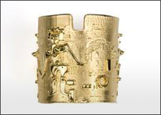 Ms. Fonssagrives-Solow’s sculptural work showcases her love of animals. I first noticed her adorable pug dog pin on the Gump’s San Francisco website; then I went looking for more and found some lovely pieces. This cuff reminds me of the work of French jeweller Line Vautrin. She tells a fascinating story of how she came to design, including wood working, sculpture and jewellery. Her bio is on her site.