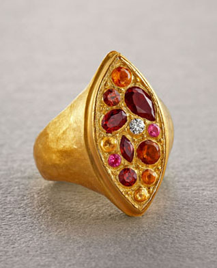Set with citrine, garnet, ruby, tourmaline, and diamonds, it is available at Neiman Marcus and other vendors, and sells for USD $4,180.
