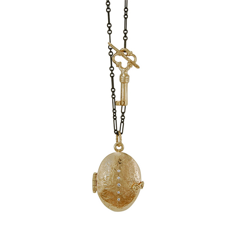 I am a complete sucker for lockets. Their dual nature … outward design and hidden secrets … the romance and mystery of them. I have a small collection of vintage lockets and am always drawn to designs that are a little bit different. This piece by Oakland, California based Sarah Greenberg reflects her upbringing by the shore back East, and translates that sensory experience into a slightly weather beaten finish and interesting closure. Most of her designs follow this aesthetic, and there are several pieces from her collection that I really like and will be featuring in upcoming posts.