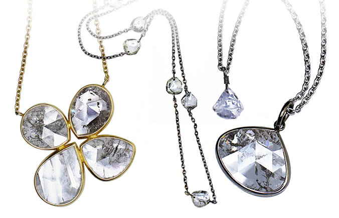 If someone were to buy me the middle necklace in the photo below, I would not say no. Welstead describes his approach to stones thus: “He does not recognise conventional gem stone hierachy and chooses stones only for beauty and charm.The collection encompasses Indian diamonds, emeralds from Zambia and Burmese spinels. Antique stones also play an important part in his work. Many of the stones are native cut and close to their natural origins in the earth. His designs focus on simple and elegant use of these beautiful stones All the jewels are hand made in English workshops with an emphasis on craftsmanship.”