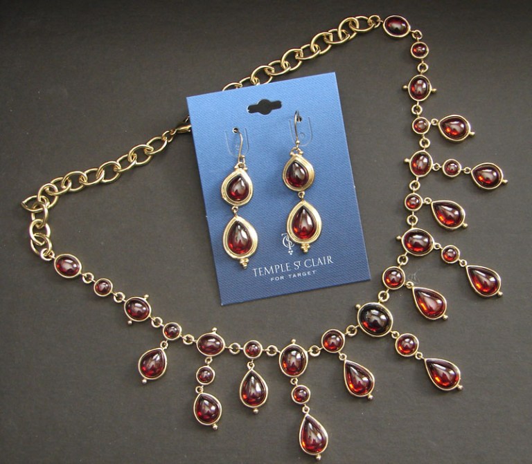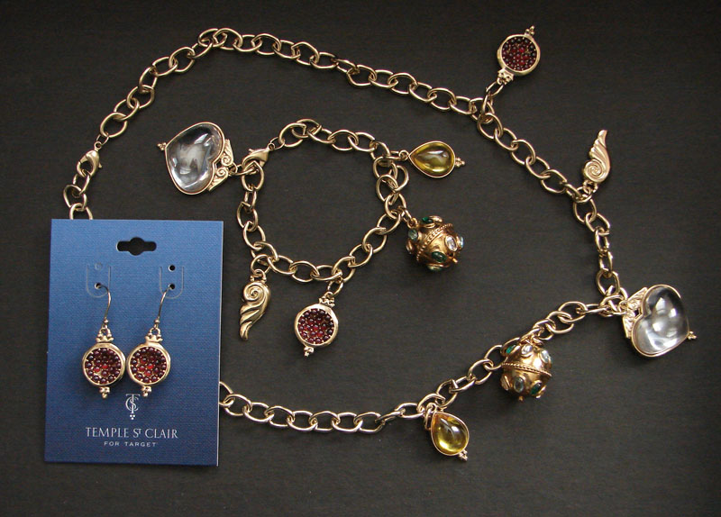 I was very pleasantly surprised by the overall quality. When I heard that St. Clair would do a costume jewellery capsule collection for Target, I really wondered how she could showcase her very luxe look at mass market prices in a way that would not compromise either her quality or design aesthetic. I think she should be very proud of what was accomplished. The pieces are solidly made and feel sturdy and good in the hand. The stones (which I believe are resin) are open backed in most cases, providing a nice sense of light and translucency. And the finish and details were higher end as well: brushed gold on the backs of earrings and some of the all-gold pieces, small sillicone stoppers on the backs of the shepherd’s crook earrings to prevent them from slipping off, and flannel drawstring bags with her name and logo printed.