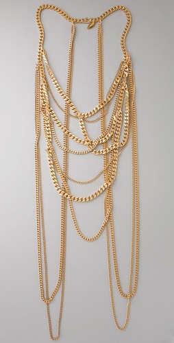 Can’t get enough of the multi chain look? Label Soo Ihn Kim (not Korean, but a name chosen by two Parsons grads) offers this artfully messy exemplar. Referred to by ShopBop as a “body chain”, it’s available for USD $270. Reminds me of similar pieces by Ann de Muelemeester.