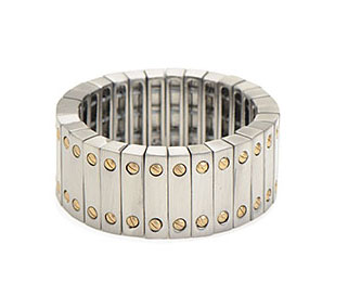 If you like the Cartier Love collection, this is an intriguing (and much less expensive) option. Like the Love bracelet on steroids. Also a lot easier to remove going through airport security checks. It doesn’t say on the web site, but my guess is that this is an expansion bracelet that fits over the wrist. I could see this being worn by men and women. Sells for USD $165 on Nicole Miller’s website.