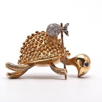 I’m usually a fan of big, as in huge, as in LARGE when it comes to pins but there is something very sweet about this tiny turtle running away with his own little sack of belongings. Crafted in 18k yellow and white gold and set with diamonds and a sapphire “eye”, it is USD $1499 from Dover Jewellers, and measures a petite 2 x 1 inch.