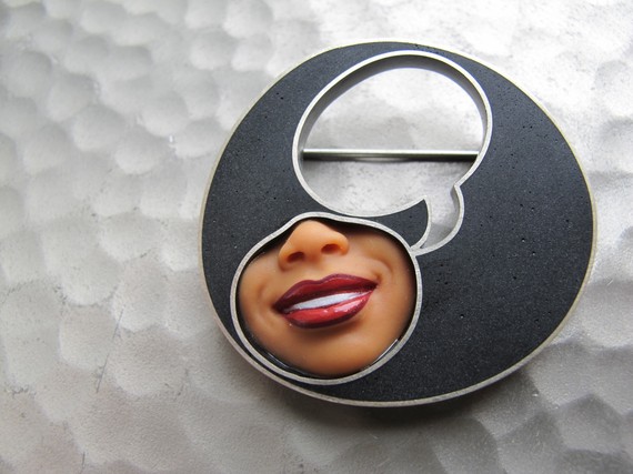 I saw artisan pieces made by Margaux Langue at Facere Jewelry Art Gallery in Seattle – they have wonderful things, if you are visiting the city (and their website can be seen here). Langue uses Barbie doll parts to whimsical, innovative and sometimes startling effect. She hass one off pieces and production items, which are less expensive. The Black Quote Bubble brooch is a production piece that can be purchased from her Etsy shop here for USD $220. Part of her Plastic Body Art series, the salvaged parts are set in sterling and accented with resin and give discarded Barbies and Kens a whole new afterlife.