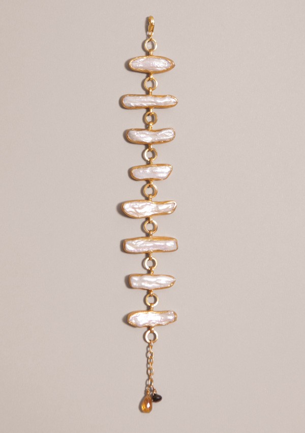 The rectangular, oddly shaped links set with mother of pearl give the timelessness of pearl a twisted spin. The bracelet is gold plated and appears to feature two small citrine drops at the toggle end. This would be really pretty as an evening look, and equally wearable to the office.