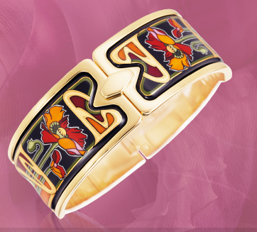 Austrian company Frey Wille does exquisite enamel work and did the enamels for Hermes until fairly recently. They are well known for their bangle bracelets, and this is a pretty example. Part of the Alphonse Mucha series, it is called Libussa. I believe these retail for about $800-1000, but you can often find vintage pieces well priced on Ebay. See this one here.