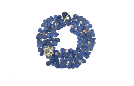 The confetti look of this necklace is most appealing and I am in love with the clasp which gives the piece its name. Made of lapis stones, with citrines sprinkled in and an 18k gold clasp, this sells for USD $3800.