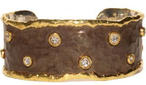 This cuff is made of brown silver accented with 24k yellow gold and set with 1.27 carats of rose cut diamonds. It is available here for USD $10,600.
