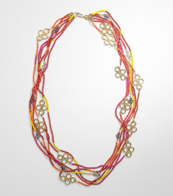 On offer here is a seed bead necklace with metal clover designs, in the bursts of bright colours seen everywhere for spring this year. A nice way to remind yourself of warmer days ahead when it’s still freezing out. Available for USD $195.