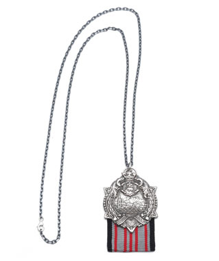 Military medals have long been deconstructed as fashion. This necklace, playing on dog tags worn by soldiers, uses an actual WWII metal finding paired with the traditional grosgrain ribbon, reimagined as an accessory. Available for USD $325 from Miansai.