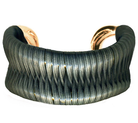 The unexpected pairing of gold coloured metal with braided deep grey leather is gives a nice twist to this cuff bracelet. It can be ladylike or edgy (and the design is also offered without the leather braiding); a versatile piece that can be worn for years. Available for USD $215 from Giles & Brother. The non leather one is also called the Cortina and is available here for USD $185.