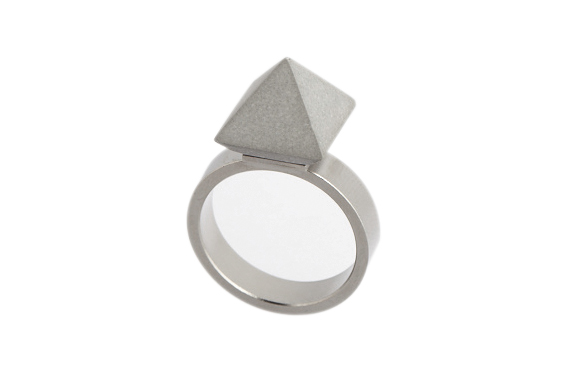 Jewellery can be made out of anything. Here, French designers Waiting for the Sun take a classic pyramid shape and render it in concrete and palladium in a unixex ring; two sizes are available and it sells for 150 Euro. Don’t miss their very funky glasses/frames. Fun colours and shapes.