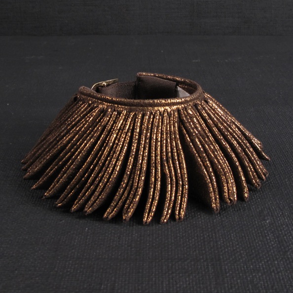 The pleasing origami look of this folded cuff, made of reclaimed leather, gives it an interesting angularity. It fastens with brass buckles, which make it adjustable.