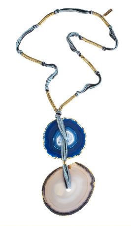Yves Saint Laurent had a hit with their Arty ring; they’ve now debuted a necklace by the same name. Made with agate slices on a woven cotton cord, it sells for USD$895. It comes in blue/grey and black/beige stones.