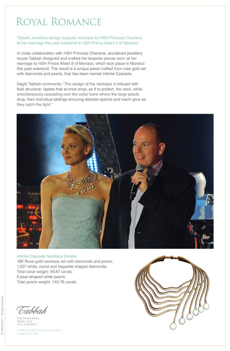 The new Princess Charlene wore this on the evening of her civil marriage, to a special concert by The Eagles. It’s quite the objet for a rock concert. Made by Dubai jewellers Tabbah, specs are below.