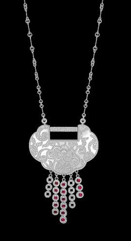 Part of a collection that uses the shape of a Chinese longevity lock, these pieces are rendered in gold and set with diamonds and precious stones. The collection features earrings, rings, and pendants. For more information on Qeelin, which works with Asian cultural references and symbols, click here.