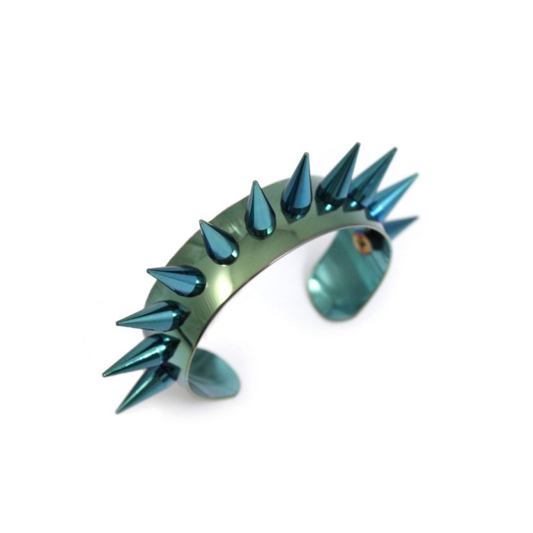 You have to love the unabashedly aggressive and in your face attitude of this spiked bracelet by Joomi Lim. Made of brass with a titanium finish and 3/4 of an inch spikes, it shows as sold out on the designer’s site. But it’s worth asking (nicely, we suggest!) if perhaps this will be coming back into stock again soon. Priced at USD $228 and part of the designer’s titanium collection (we thought we’d find it in their Love Hurt section, actually). There is also a fun chain link bracelet with spikes, also alas, showing as sold out.