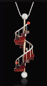 I’m not sure what occasion would require commemoration with a piece of jewellery that looks like a staircase, but I’m sure something could be found. This is made with coral beads, gold and diamonds, and the individual stair risers are made of tiny pieces of mahogany. This is my idea of the stair master… Additional pieces by Prediletto can be seen here. Matching earrings are also available.