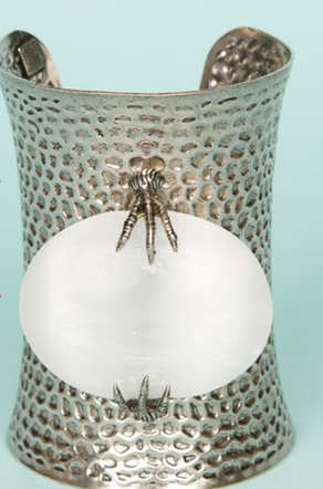 Giving a twist to the sleekness of the tubular cuff bracelet, designers Mark Walsh and Leslie Chin have added a prehistoric element with this “egg” and dinosaur claws holding it to the silver cuff. The two describe their design philosophy this way: inspired by architecture, mixed textiles, and, of course, their personal treasure trove of vintage fashions, mark walsh & leslie chin design jewelry with a fearlessness that allows them to create ornate, innovatively constructed pieces that endure. by way of complex treatment processes, trial-and-error color-matching, and relentless observation, the duo crafts pieces that are unparalleled in aesthetic.