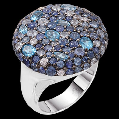Many fine jewellers are offering more in sterling silver and other metals with the persistently high price of gold. This dramatic ring is set with sapphires and blue topaz stones, a little over 6 carats total weight. Available from jeweller JR Dunn for USD $900.