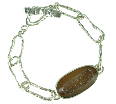 This one of a kind sterling silver and druzy bracelet features a pretty hammered link chain with a 1 inch druzy stone as the main accent.