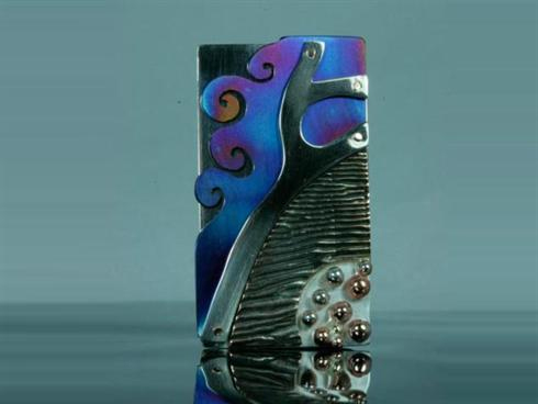 New Zealand jeweller Deanna Gracie does beautiful work inspired mostly by nature and local landscapes. This piece is composed of sterling silver, 9 and 18k gold, and a Japanese technique called shibuichi, a four-to-one alloy of copper to silver, producing a greyish metal.