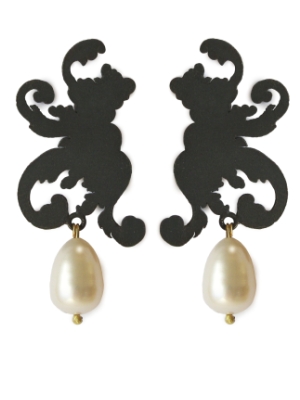 British designer Marianne Anderson offers these oxidized sterling silver earrings with a freshwater pearl drop. She describes them this way: The contrast of the dark silhouette against the white freshwater pearl drop pearl creates an elegant contemporary take on a classic ornamental motif. Comfortable on the ear – the shape fits snugly around shape of face.