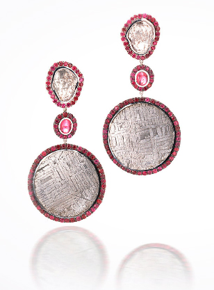 These earrings feature meteorite, accented with diamond slices, pink spinel and rubies. There are no prices indicated, but I’m guessing five figures. See other earring designs here.