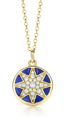 There are some very pretty designs in Paloma Picasso’s new Venezia collection for Tiffany, inspired by design elements in the Italian city. Tiffany describes this blue enamel, diamond and 18k gold pendant as “patterned after the gold eight-pronged stars featured on the backdrop to the famous lion sculptures gracing the Basilica San Marco in Venice.” Actually, I associate this kind of design and enamel with French pieces from the turn of the 20th century…