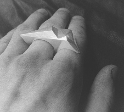 Saeter describes his work this way: “Jewelry by eric saeter was conceived in 2008 to satiate the tastes of the designer himself as well as the demands of a market which lacked wild, surreal structures from formal, gorgeous materials for the hand or neck.”
