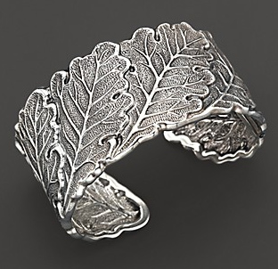 Bloomingdales has recently begun to carry a range of higher end jewellery designers, including renowned Italian silversmiths Buccellati. This beautiful repousse sterling silver cuff with an oak leaf design. Price is about USD $1200; please check on the Bloomingdale‘s site (I got the price in Canadian currency; other visitors will likely see a different price).